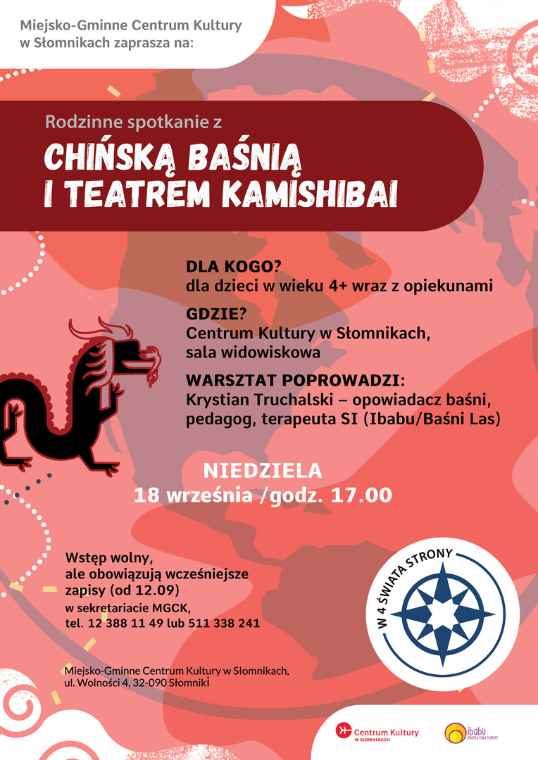 W ramach akcji "W 4 świata strony" zapraszamy na rodzinne, baśniowe spotkanie, które w naszym Centrum Kultury poprowadzi pan Krystian Truchalski - opowiadacz, storyteller, pedagog i terapeuta SI. Tym razem wybierzemy się w podróż do Chin, a baśni opowiadanej z użyciem techniki teatru kamishibai towrzyszyć będą: bęben i dzwonek japoński.